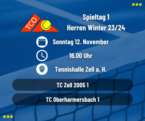Am Sonntag um 16 Uhr beginnt Wintersaison 2023/2024 mit einem „Gastspiel“ beim TC Zell 2005. Insgesamt stehen fünf Partien für die Herrenmannschaft aus Oberharmersbach auf dem Programm, die im Zeitraum von November 2023 bis Februar 2024 ausgetragen werden...